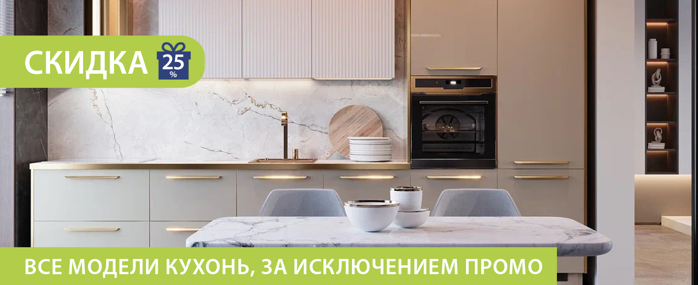 При покупке кухонного гарнитура и выборе фурнитуры Лайт (DTC) скидка на любую модель составит 25%. Исключение - кухни линейки Промо, на них скидка 5% (с фурнитурой Лайт).