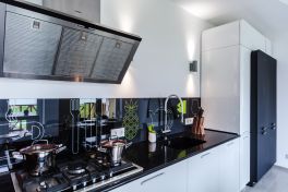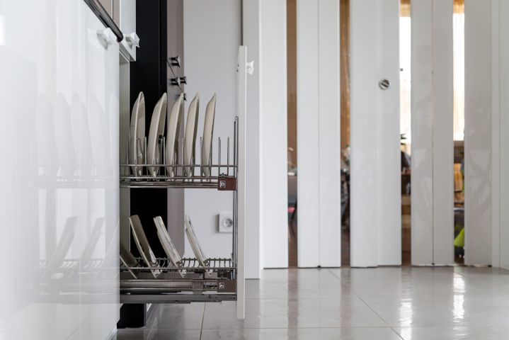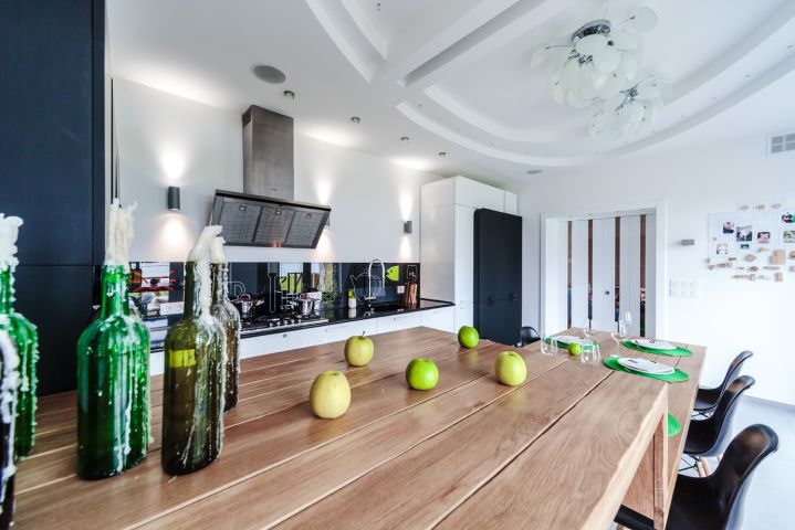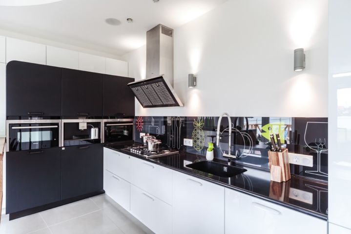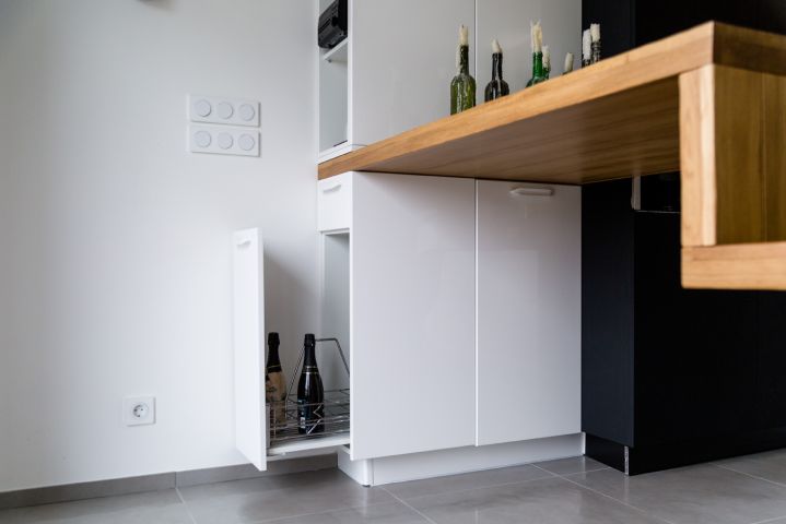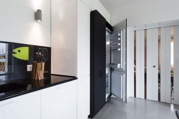 Чтобы не перегружать лишними деталями легкое и воздушное пространство кухни, гарнитур выбрали минималистичный. Как и мечтали герои, мебель расположили буквой «Г» – это отличный вариант для помещения такой конфигурации. Белые фасады почти сливаются со стенами, и на первый план выходят черные: они расположены в разных частях комнаты, а столешница – своеобразный мостик между ними. Гарнитур не выглядит строгим благодаря скругленным формам. Все шкафчики глубокие – 58 см. Корпуса сделаны из ламинированной ДСП, фасады – из МДФ, сверху нанесена эмаль, все дверцы оснащены доводчиками для бесшумного закрывания.Основная рабочая зона находится между двумя высокими шкафами для хранения продуктов и встроенной техники. В шкаф, расположенный параллельно столешнице, встроены два холодильника и выкатная колонна для сухих продуктов. Под рабочей поверхностью – посудомоечная машина, сушилка для посуды и эргономичные выдвижные ящики для хранения столовых приборов и тарелок разного размера. Они оснащены удобными металлическими и деревянными держателями.Белый шкаф, расположенный ближе к окну, открывается с торца и состоит из ящика для мелочей и выкатного ящика для бутылок. Над ними – полка с открытыми нишами, где можно, например, хранить мобильные устройства и подзаряжать их. За черными распашными дверцами верхнего яруса скрываются полки для посуды, а центральные пеналы безраздельно принадлежат современной бытовой технике. «Мертвая» зона в углу кухни тоже задействована – ящики с выдвижной арматурой превращают ее в полезное пространство для хранения. Столешница с литой интегрированной мойкой выполнена из ударопрочного и устойчивого к загрязнениям кварцевого камня с добавлением синтетических материалов и солей серебра. Ионы серебра обеспечивают антибактериальную защиту поверхности, специальные ингредиенты – износостойкость, а натуральный кварц – естественную красоту.