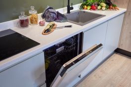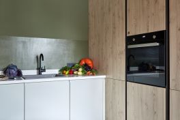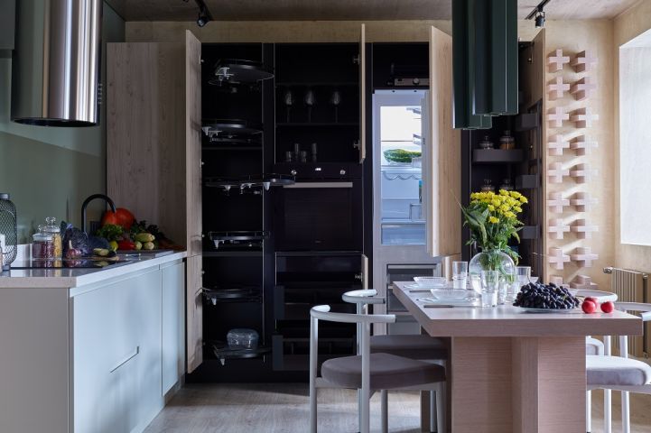 Поверхности не просто схожи, а связаны между собой чёрным цветом. На потолке в нём выполнены софиты, а на кухне – цоколь и профили системы «Space Line». Это та самая система открывания фасадов без ручек, которая делает поверхности гарнитура максимально объемными и выразительными! Кстати, тёмные элементы здесь присутствуют не только снаружи. Всё внутреннее пространство пенальной группы также выполнено в стильном чёрном цвете. Пеналы оснащены удобными аксессуарами для хранения продуктов и утвари, а также встроенным холодильником и духовым шкафом на удобной высоте.