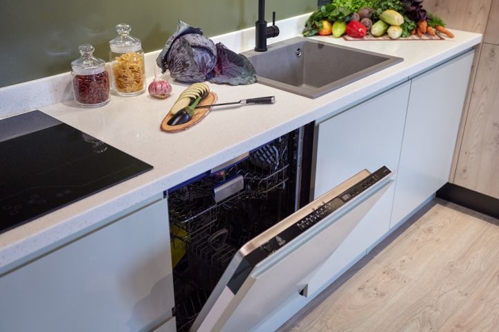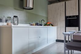 Вторая часть кухни – это «Оскар» с покрытыми эмалью бело-зеленоватыми фасадами. Видимых ручек здесь также нет, они интегрированы в сами фасады. В зоне «Оскара» находятся мойка, вытяжка, посудомоечная машина и варочная панель. Мойка и столешница выполнены из высокопрочного искусственного камня. Имеются ящики-тяжеловесы для крупной посуды, держатели для фольги, ножей и пищевой пленки, а также современные органайзеры и системы хранения. Зона «Оскара» – это идеальное место для активного кулинарного творчества!