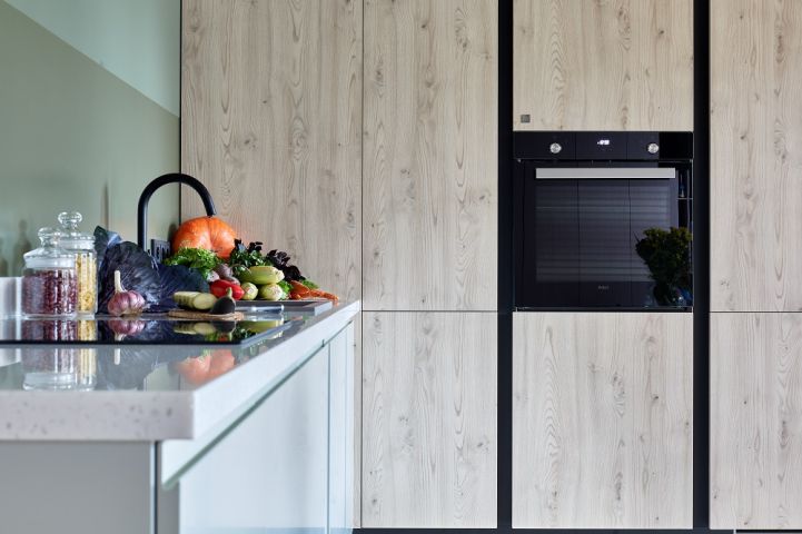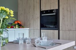 Первый – «Стоун Вуд»! От него здесь пенальная группа, и это настоящая ода естественным фактурам! Фасады из экоплиты Egger безупречно имитируют поверхность дерева «Каштан Кентукки» визуально и тактильно. Кстати, древесный рисунок полностью идентичен рисунку напольного покрытия и потолка. Благодаря этому кухня становится гармоничной частью общего интерьера!