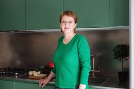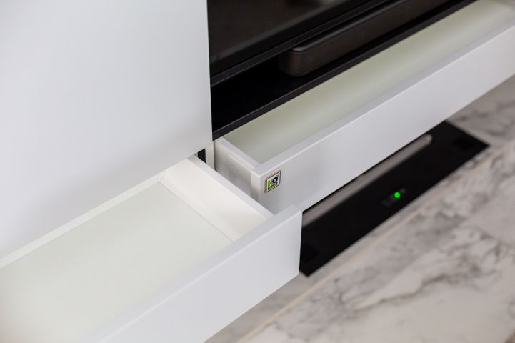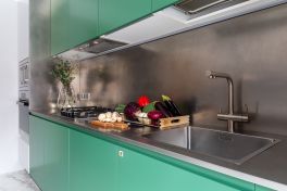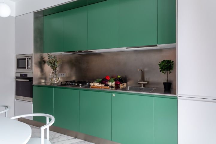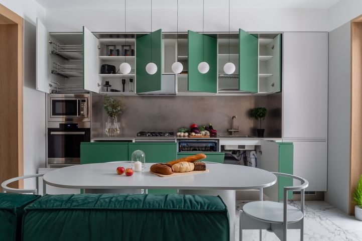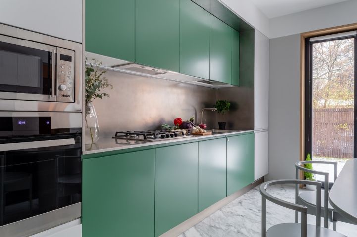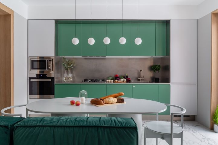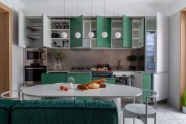 Сначала о кухне! Выверенная форма здесь задаёт тон, а цвета и материалы создают настроение. В кухне использована стильная комбинация серого и тёмно-зелёного цветов. Первый – отсылка к северному спокойствию, второй – к южной теплоте. Это редкое цветовое сочетание смотрится удивительно свежо! Гарнитур оснащён полным комплектом встраиваемой техники «Haier», а также огромным количеством аксессуаров и систем хранения. Здесь есть: большие ящики с разделителями внутреннего пространства «Orga-Line», система для хранения крупной посуды, комплекс выкатных сеток, ящик для хранения столовых приборов с системой «ручка+поводок», выдвижная корзина для хозяйственных принадлежностей, мусорное ведро с функцией автоматического открывания и многое-многое другое.