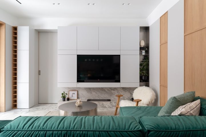 Строгий и одновременно «душевный» минимализм – вот что нужно было отразить в этих интерьерах. Для решения этой задачи в кухонной зоне дизайнеры «KD-Lab» избрали гарнитур «Оскар» с особыми фасадами из покрытой эмалью МДФ. А гостиную создали на основе модели «Фаворит», чьи фасады также покрыты эмалью, но по несколько иной технологии.
