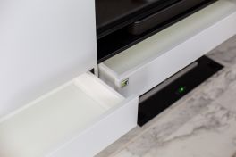 Теперь о гостиной! Она создавалась на основе модели «Фаворит» и имеет фасады, каждый из которых открывается лёгким нажатием при помощи системы «Tip-On». Деление фасадов по горизонтали соответствует расположению панелей на стенах, а ниша под ТВ-зону оформлена чёрным цветом, что делает телевизор практически незаметным. Стильный мини-камин довершает образ интерьеров, в которых красота юга и севера пребывают в идеальной гармонии!