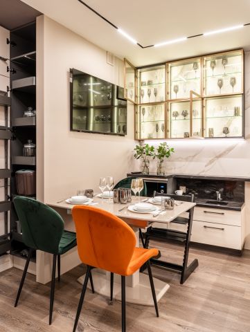 Проект полон эксклюзивных решений. Самое заметное – разноуровневые рабочие зоны, каждая из которых имеет столешницу из искусственного камня и собственную мойку. Зона с невысокими элементами разработана специально для Данилы: здесь есть компактные ящики и СВЧ-печь на комфортной высоте. А в цоколе полноразмерной зоны установлены уникальные выдвижные ступеньки. С их помощью хозяин кухни может свободно пользоваться всеми ящиками нижнего уровня, а остальные домашние – легко доставать до верхнего яруса!