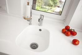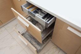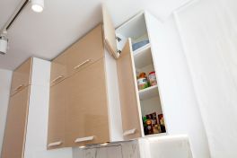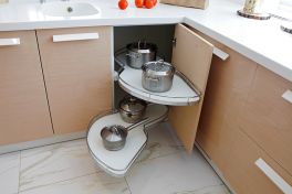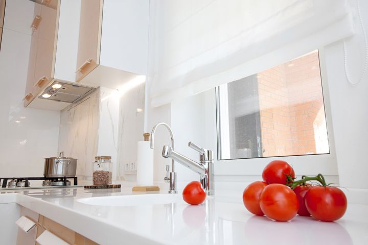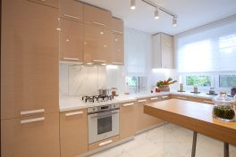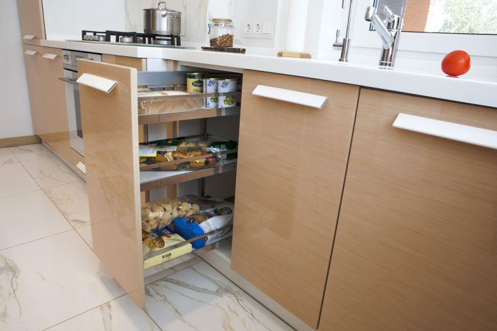Кухню героев маленькой не назовешь. Здесь – 10 м2. Но раньше пространство было спланировано нерационально – рабочая зона располагалась в темном углу, и хозяйке негде было развернуться во время приготовления многочисленных блюд. К тому же здесь совершенно не хватало мест для хранения. Эту неудобную ситуацию дизайнеры изменили в корне. Выстроили гарнитур буквой «Г» – продолжили рабочую зону вдоль всей стены и задействовали все пространство под окном прилегающей стены. Корпуса шкафов изготовлены из ламинированной ДСП белого цвета, а фасады – из покрытой шпоном МДФ цвета выбеленного дуба.Вся рабочая зона кухни накрыта столешницей из искусственного камня Montelli белого цвета с небольшими вкраплениями «снежинок» – белых камушков. За счет такой пестрой расцветки удалось визуально скрыть места стыков полотен столешницы. Под окном установили интегрированную бесшовную мойку из того же материала. Такая конструкция очень удобна, поскольку ее легко чистить, а грязь не забивается в стыки.При конструировании гарнитура из внутреннего объема столов «выжали» максимум – не пропало ни миллиметра. Основные системы хранения, которых раньше было явно недостаточно, разместились в нижнем ярусе. К оптимизаторским решениям относится, в частности, трехсекционный выдвижной ящик, все секции которого расположены за одним фасадом. Верхнее отделение для вилок и ложек снабжено специальной «ручкой-поводком». Если ее нажать – маленький ящик откроет доступ к двум другим ящикам, которые расположены под ним.В углу нижнего яруса смонтирована система с выдвижными сетками в виде «восьмерки», которая позволяет максимально функционально задействовать «мертвый» угол. Полки могут полностью выдвигаться из шкафа и загружаются сверху. К тому же уровни системы двигаются независимо друг от друга.Верхний ярус гарнитура расположен только вдоль боковой стены кухни. В навесных ящиках находятся многочисленные полки – сушки расположены в нижнем ярусе, справа от мойки. Видимые боковины шкафов выполнены из фасадного полотна. При этом их лицевые панели шпонированы, а боковые панели выполнены в цвет столешницы.